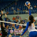 Right side hitter Tangerine Wiggs gets a kill for the Gators in the third set of Sunday’s match.