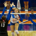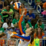 Outside hitter, Gabby Mallette, gets a block for the Gators in the third set of Sunday’s match.