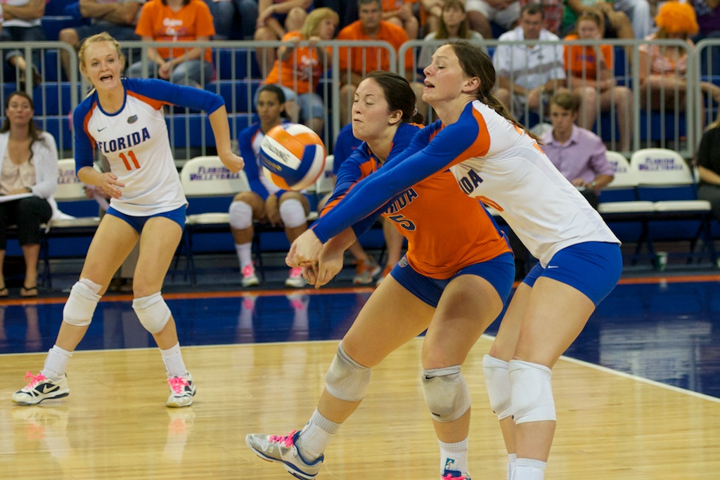 Both libero Taylor Unroe and defensive specialist Holly Pole go for the return of serve in the third set of Sunday’s match.