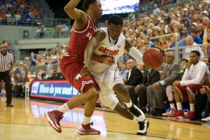 Michael Frazier (20) had six points before he left the game injured in the second half of Saturday’s game.