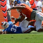 Quarterback Tyler Murphy (10) gets sacked during a scrimmage Saturday afternoon at the Orange and Blue Debut.