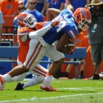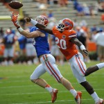 Running back Trey Burton (8) practices in a scrimmage Saturday afternoon at the Orange and Blue Debut.