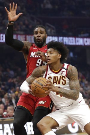Cleveland Cavaliers’ Kevin Porter Jr. (4) drives past Miami Heat’s Jae Crowder (99) in the first half of an NBA basketball game, Monday, Feb. 24, 2020, in Cleveland. (AP Photo/Tony Dejak)
