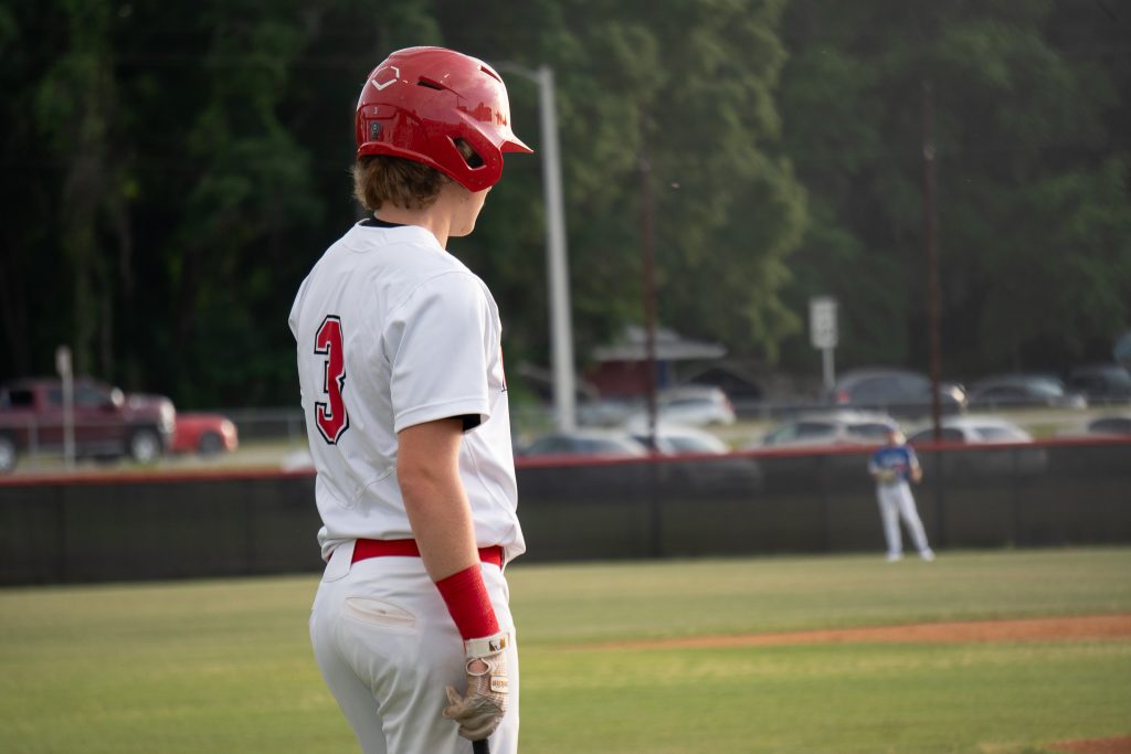 Santa Fe’s Cooper Ruppert talks with coach after a great play at first base. [Jauntre’ Gray]