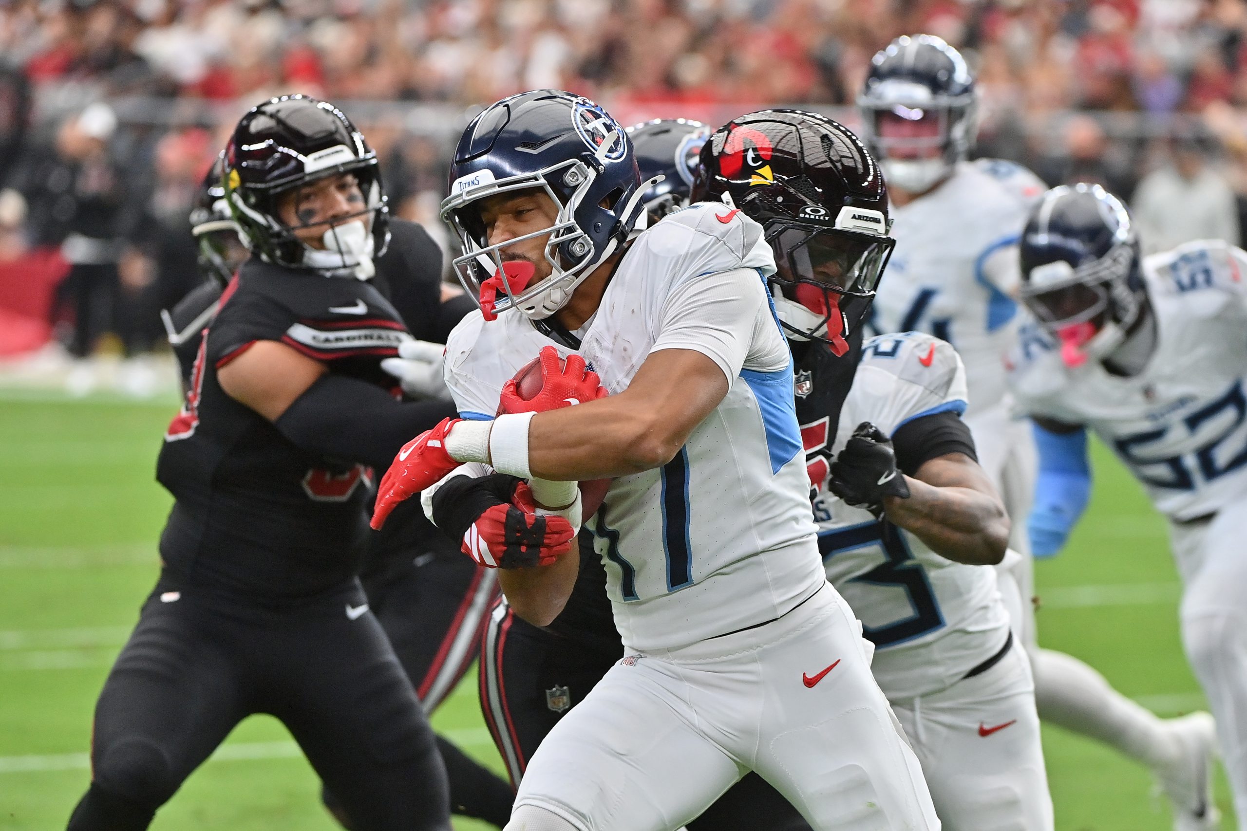 Tennessee Titans wide receiver Chimere Dike (17) returns a kickoff against the Arizona Cardinals during the first quarter Sunday at State Farm Stadium. [Matt Kartozian-Imagn Images]