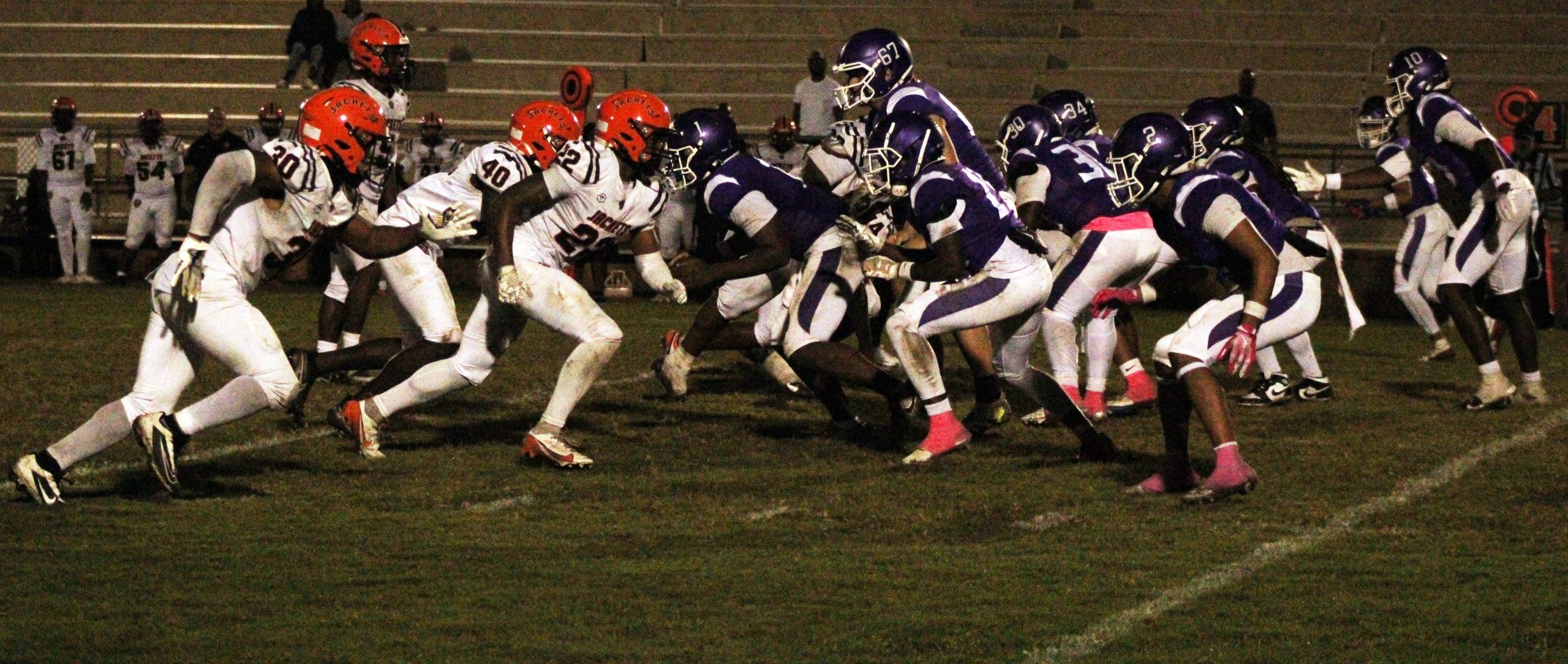 The Gainesville High Hurricanes and the Leesburg High Hornets launch from ready position after the ball is hiked at Citizens Field on Thursday. [Riana Morales/WRUF]