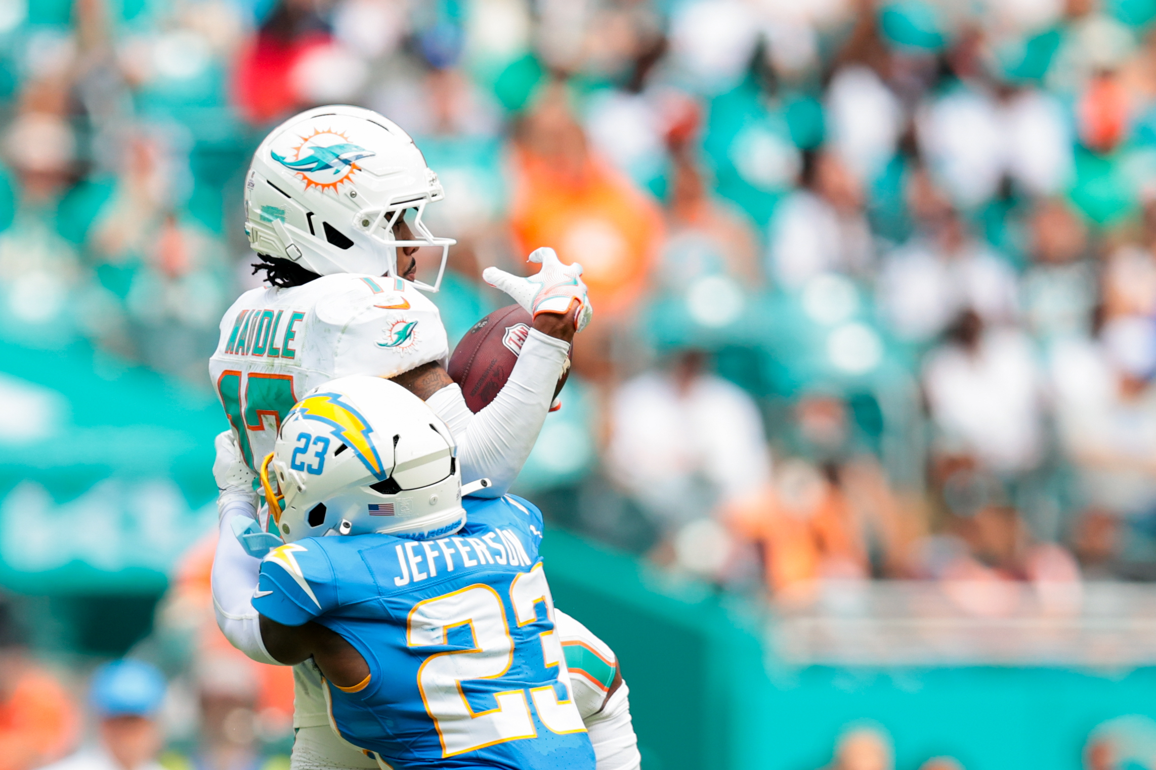 Miami Dolphins wide receiver Jaylen Waddle (17) catches the football against Los Angeles Chargers safety Tony Jefferson (23) during the fourth quarter at Hard Rock Stadium last Sunday. [Sam Navarro-Imagn Images]