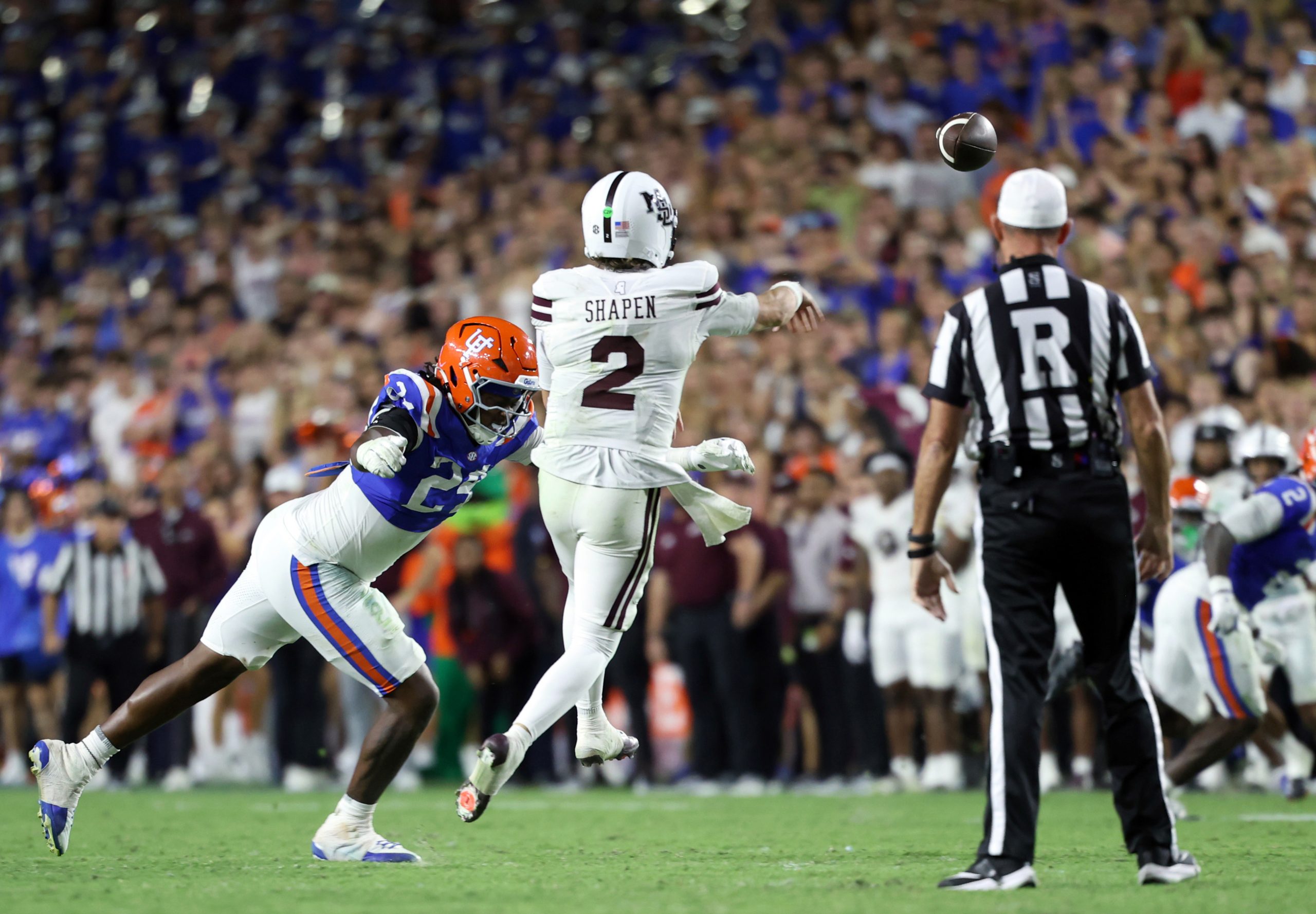 Mississippi State's Blake Shapen (#2) throws the ball during the Gators’ game against Mississippi State at Ben Hill Griffin Stadium in Gainesville, Fla., Saturday night, Oct. 18, 2025. (Libby Clifton/WRUF)