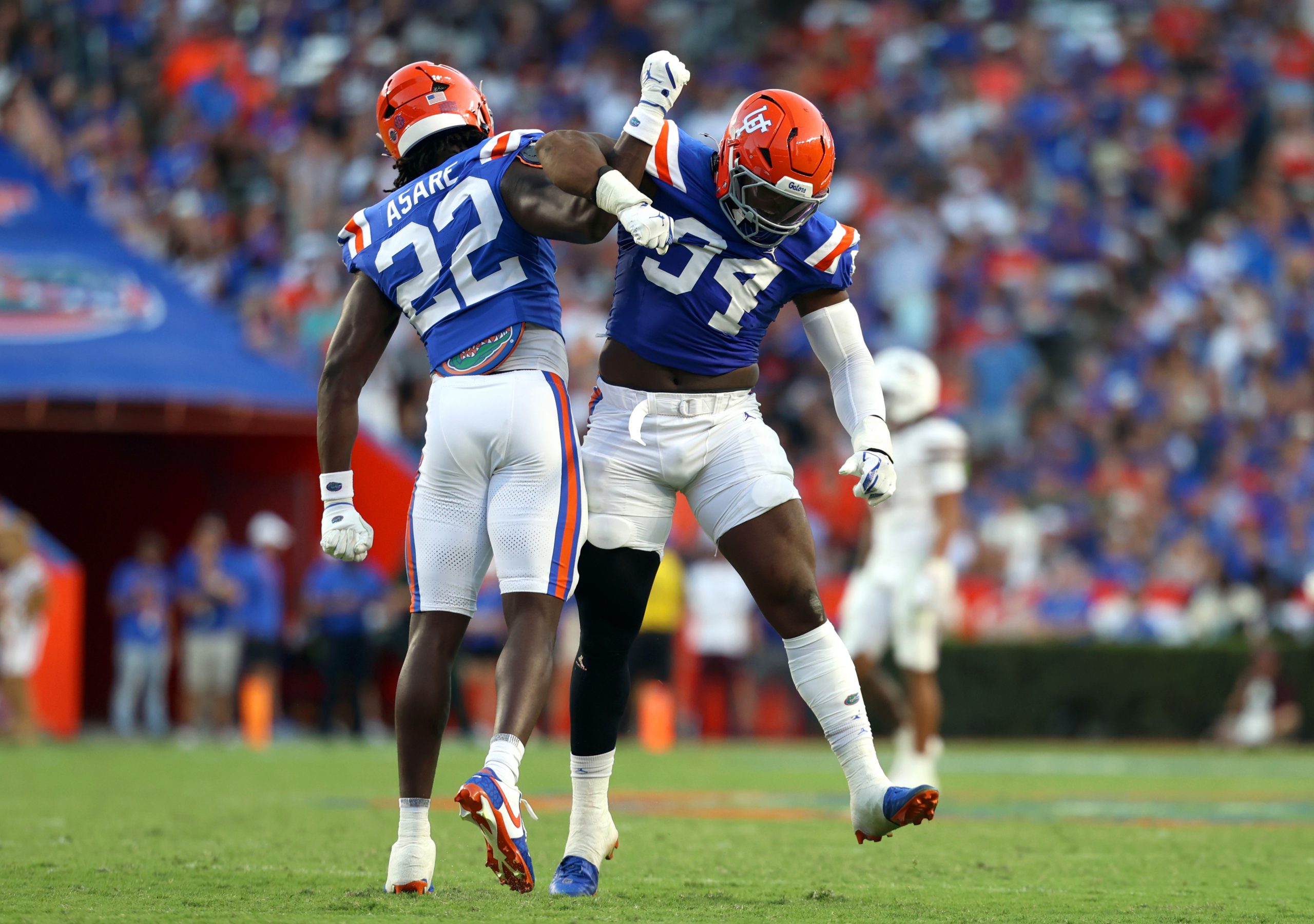 Kofi Asare and Tyreak Sapp celebrate on the field during the Gators’ game against the Mississippi State Bulldogs at Ben Hill Griffin Stadium. (Libby Clifton/WRUF)