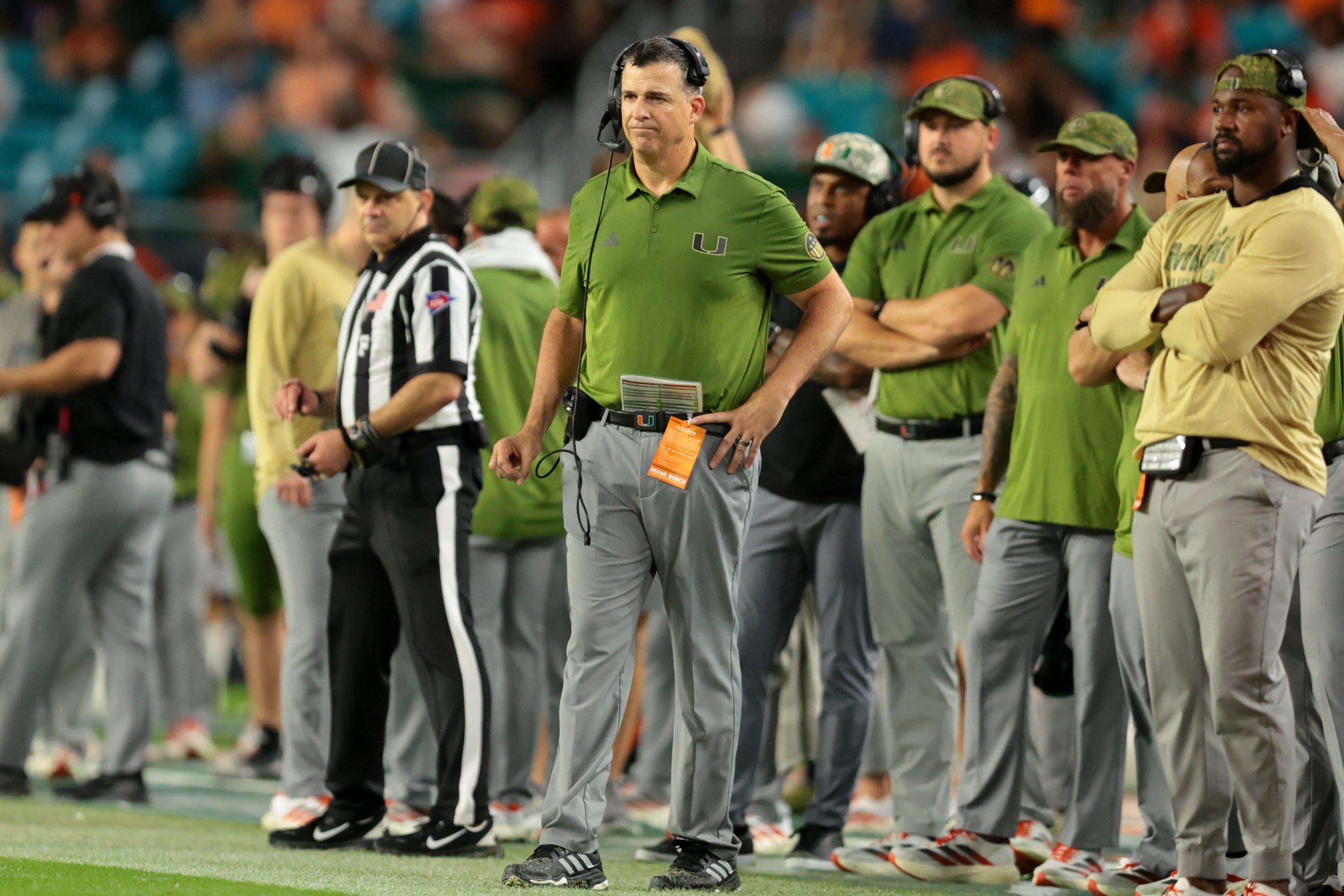 Miami Hurricanes coach Mario Cristobal watches from the sideline against the Stanford Cardinal during the fourth quarter at Hard Rock Stadium. [Sam Navarro-Imagn Images]
