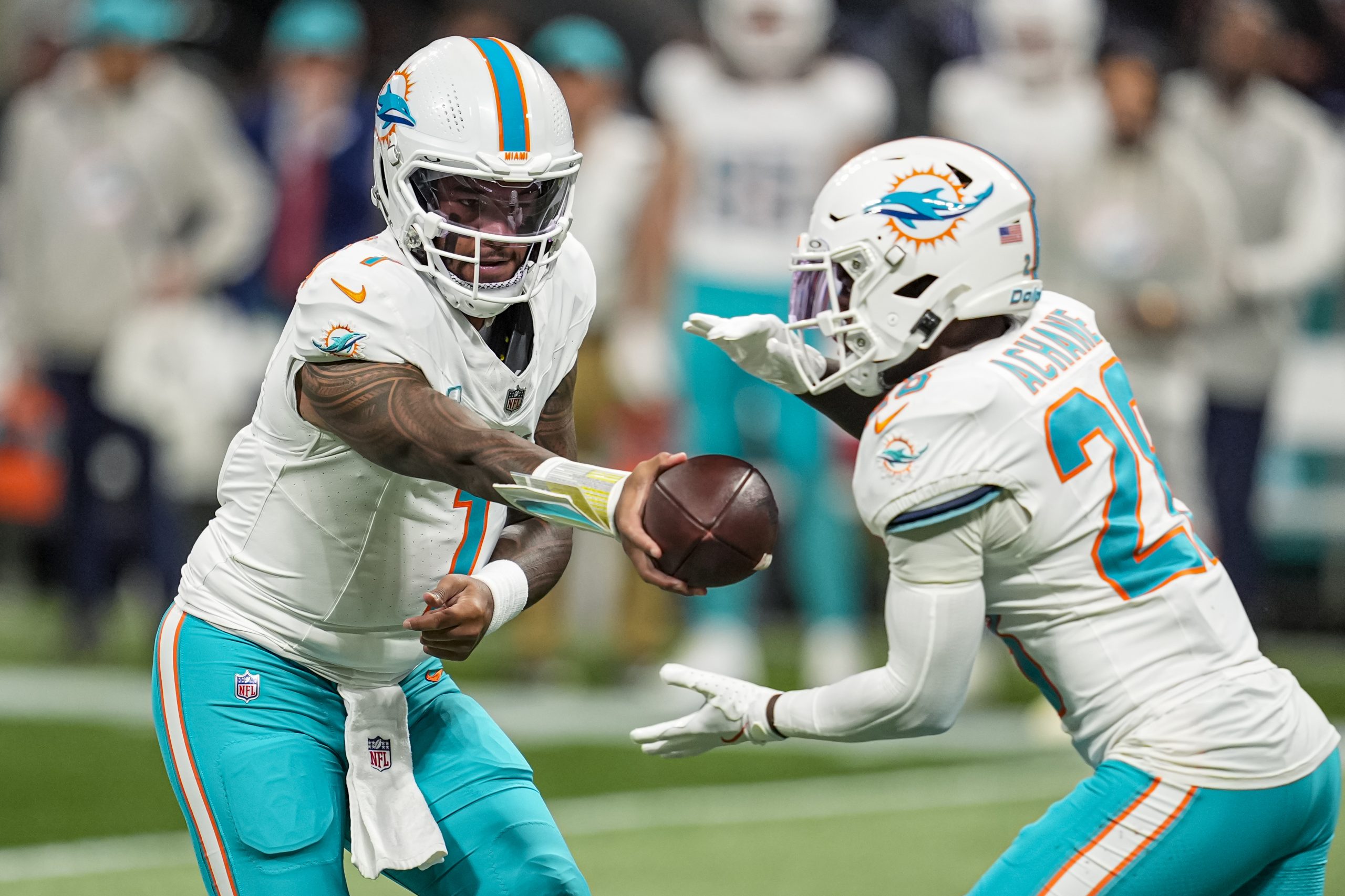 After finding himself on the injury list prior to kickoff with a swollen eye, the sixth-year man proved he could still perform at the highest level. His four touchdowns slotted him second in the Dolphins’ record books. Tagovailoa now trails Miami legend Dan Marino in games with four scores through the air, after jumping Super Bowl-winning quarterback Bob Griese.
