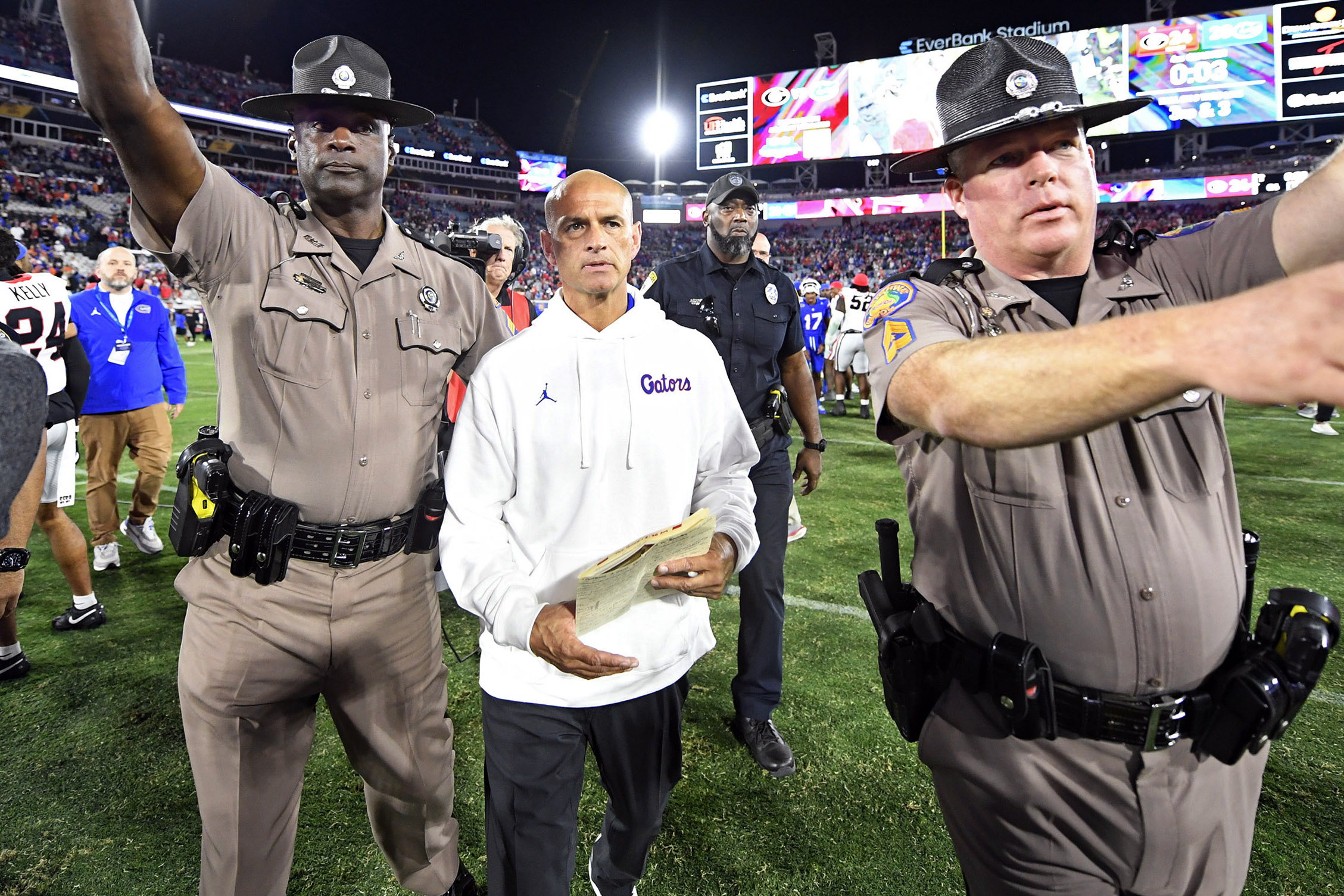 Florida coach Billy Gonzales walks onto the field after Saturday's 24-20 loss to Georgia. (Matthew Lewis/WRUF)