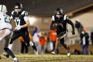 Buchholz Bobcats wide receiver Justin Williams (13) rushes with the ball against the Jacksonville Mandarin Mustangs during the second half of the 2025 FHSAA Football State Championships 6A Regional Finals at Citizens Field on Nov. 28, 2025. [Matt Pendleton/Gainesville Sun]