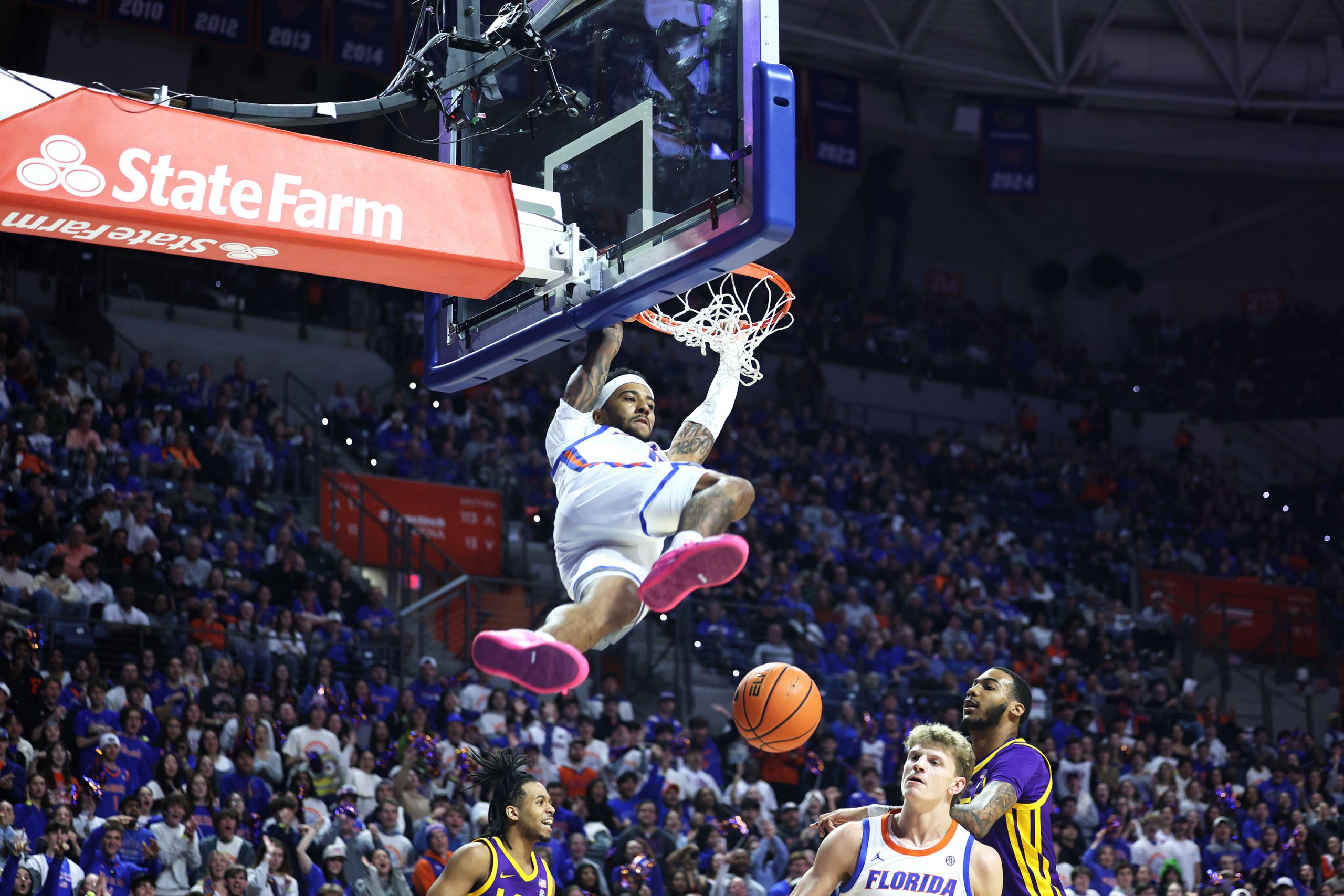 Florida guard Boogie Fland finishes a slam dunk during the first half of the game against LSU at the Stephen C. O'Connell Center. (Riley Beiswenger/ WRUF)