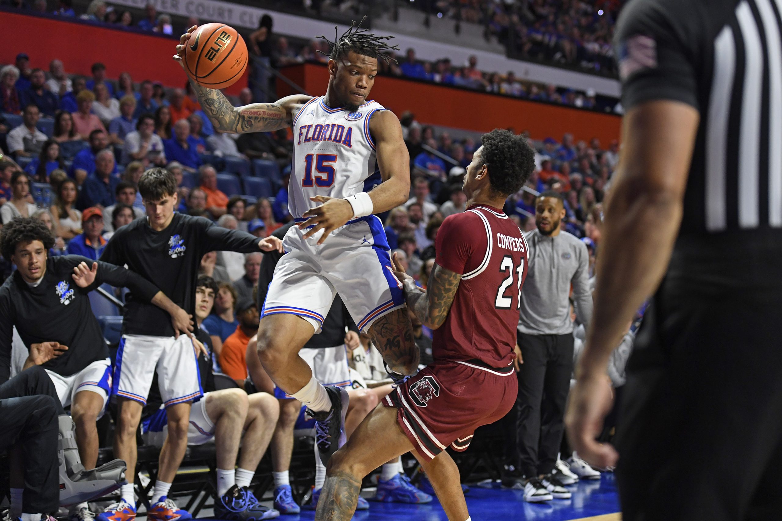 Former Florida guard Alijah Martin (15) looks to throw the ball off of a South Carolina guard as the Florida Gators face the South Carolina Gamecocks on Saturday, Feb. 15, 2025, at the Stephen C. O'Connell Center in Gainesville, Fla. (Matthew Lewis/WRUF)