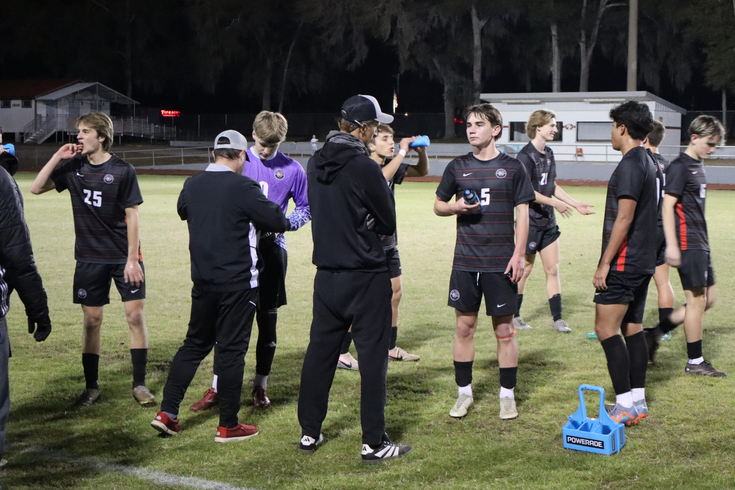 Santa Fe High boys soccer coach Morgan Dall'Acqua addresses his team during a water break in the regional quarterfinal match against Suwannee. [Abby Slate/WRUF]