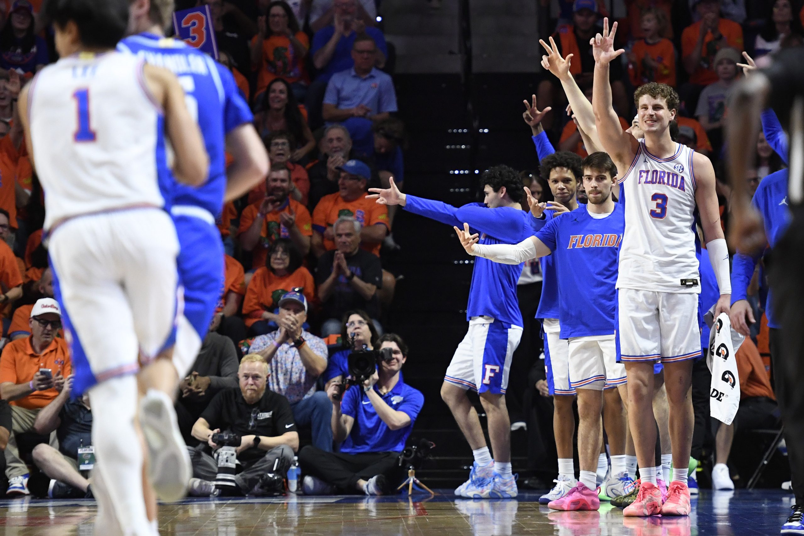 The Florida bench reacts after a Xaivian Lee (1) 3-pointer against the Kentucky Wildcats at the O’Connell Center on Saturday. [Matthew Lewis/WRUF]