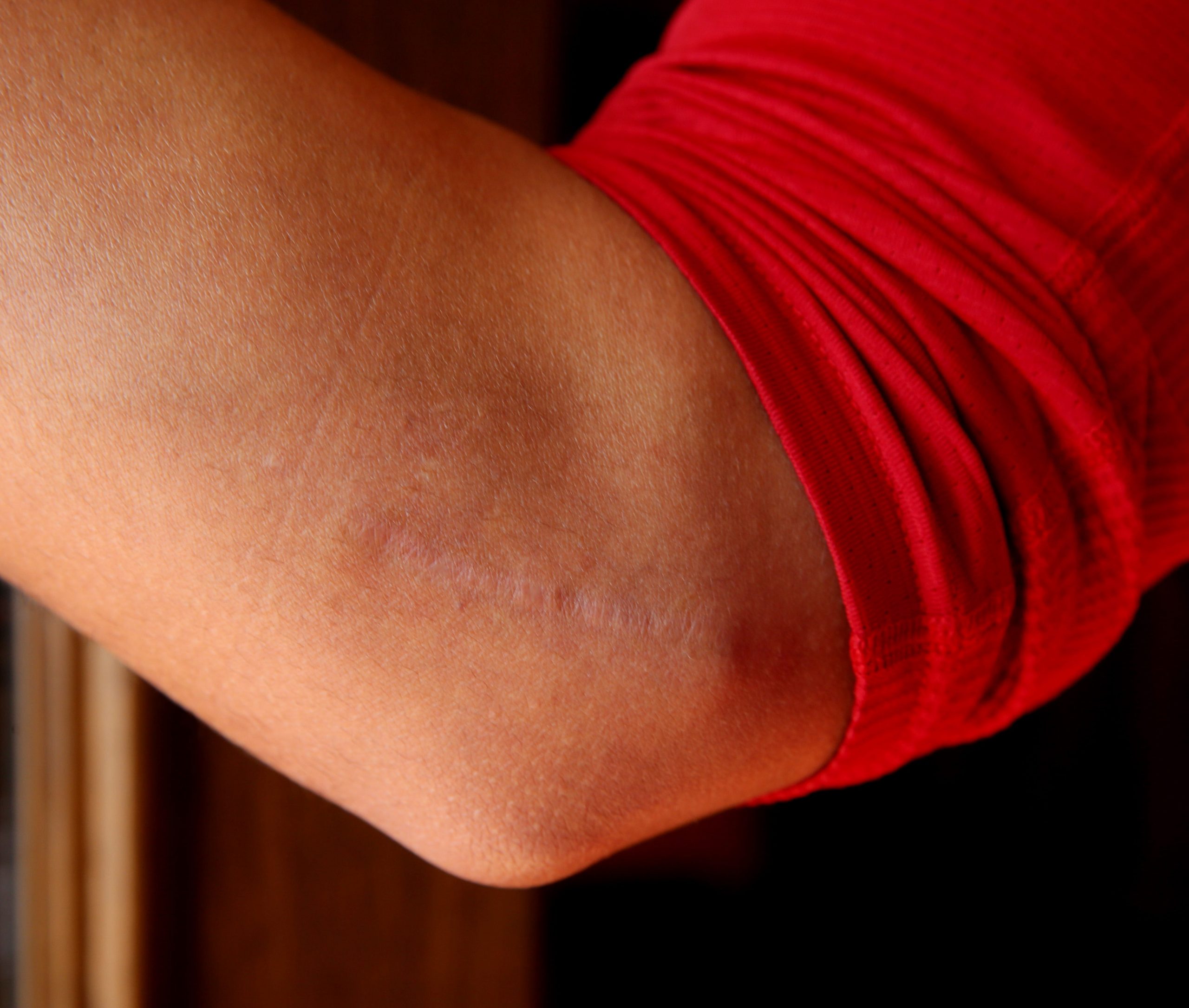 Lenny Torres shows his scar from Tommy John surgery at his home in Beacon on Nov. 26, 2019. Torres was drafted by the Cleveland Indians in 2018 and injured his elbow in April 2019. [Poughkeepsie]