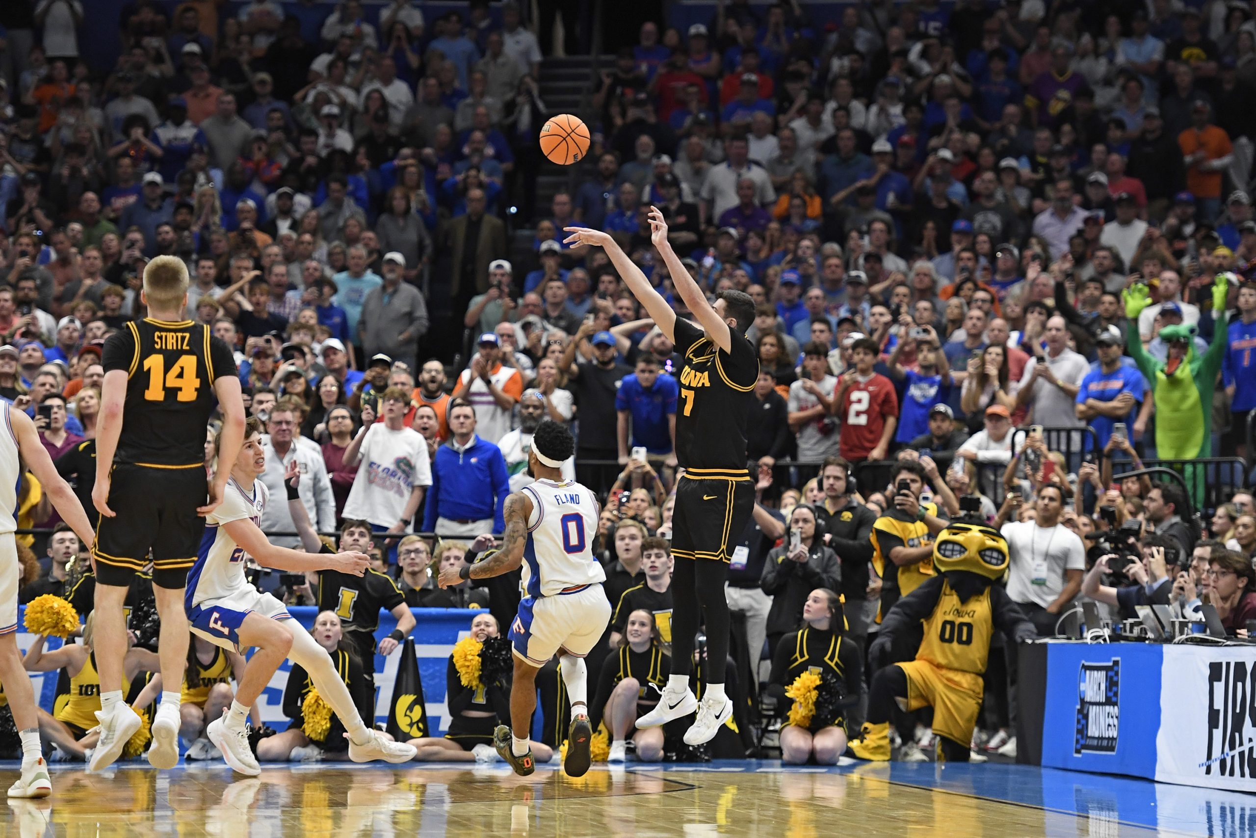 Iowa forward Alvaro Folgueiras (7) shoots the game-winning 3-pointer that helped upset the top seed Florida Gators on Sunday at Benchmark International Arena in Tampa. [Matthew Lewis/WRUF]