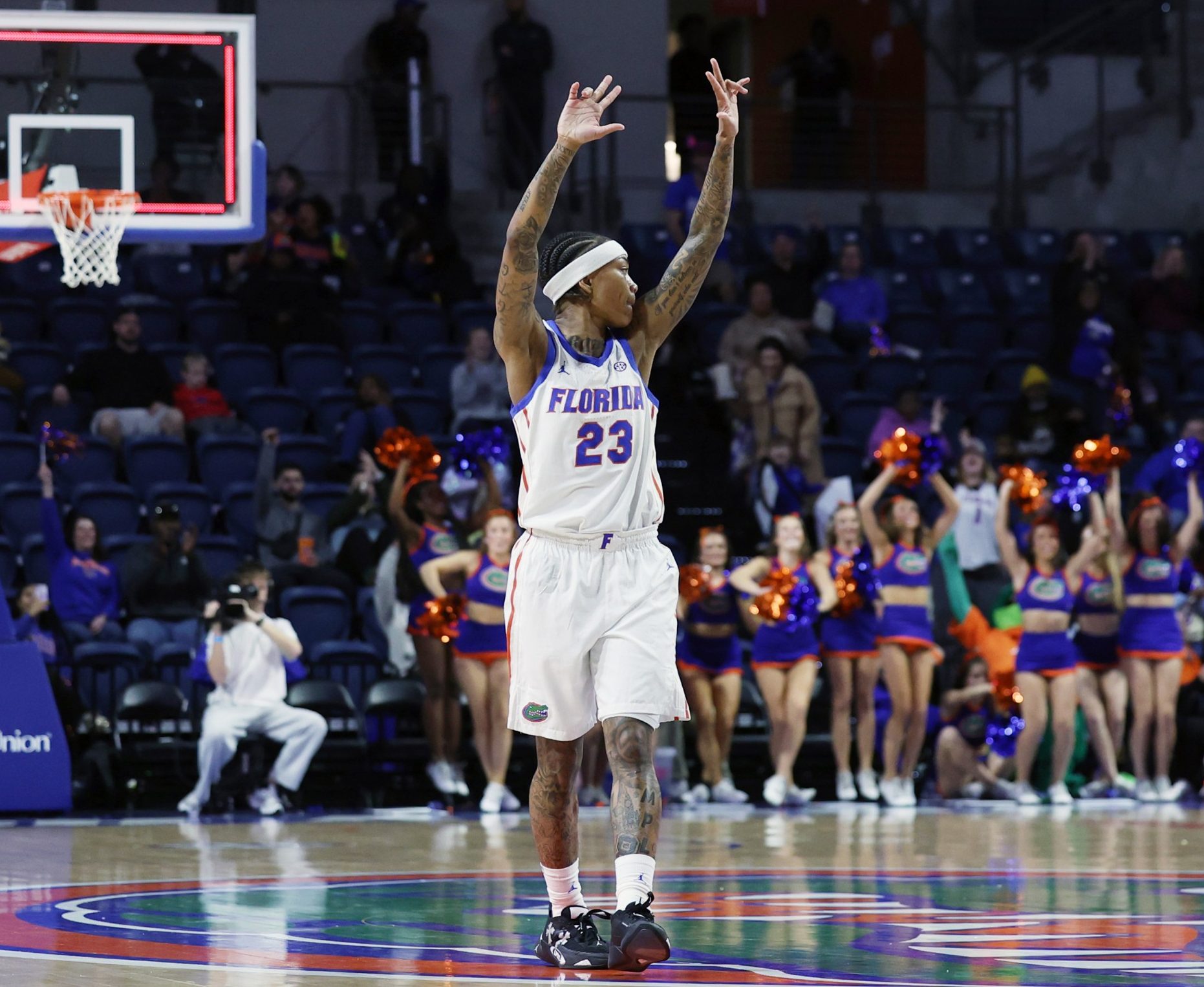 Liv McGill (23) celebrates Me’Arah O’Neal’s 3-point shot during a game against the University of Texas at the Stephen C. O’Connell Center in Gainesville, Fla., on Thursday, Jan. 29, 2026. (Riley Beiswenger/WRUF)