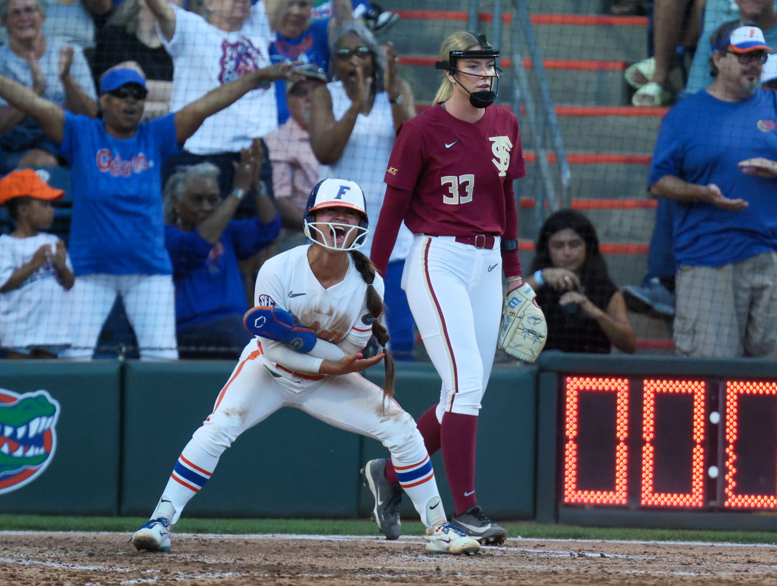 In the seventh, Thomas called game. With the Gators one out away from victory, the redshirt freshman made a diving catch of a rapidly falling Anna Hinde liner to left field to end the game. The out was confirmed after video review.